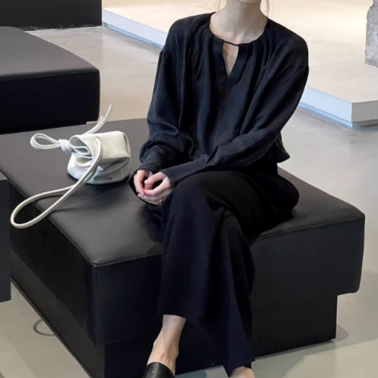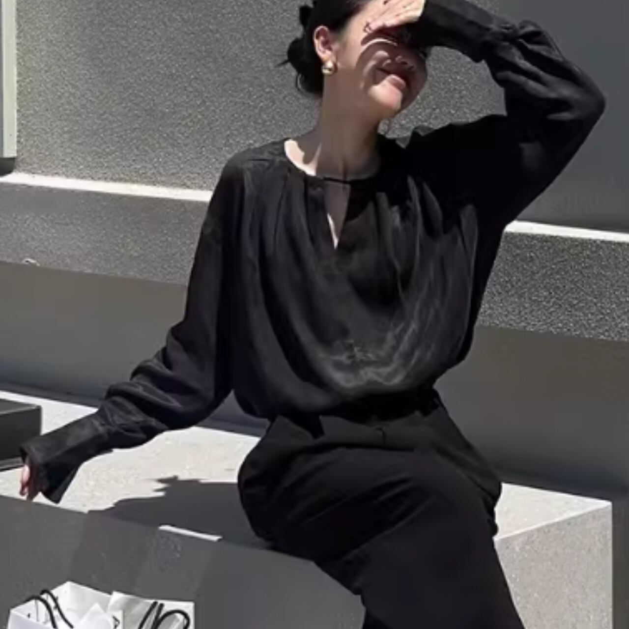 ゆったりとしたシルエットとシルクのような光沢感のある生地が魅力的な長袖シャツ。 広がりすぎないVネックデザインが顔周りをすっきりと演出します。 【サイズ】 S:肩幅52cm/胸囲100cm/着丈73cm/袖丈52cm M:肩幅53cm/胸囲104cm/着丈74cm/袖丈53cm L:肩幅54cm/胸囲108cm/着丈75cm/袖丈54cm XL:肩幅55cm/胸囲112cm/着丈76cm/袖丈55cm ※海外製品のため、1-3cm程の誤差がある場合がございます。 【カラー】 ブラック 【素材】 ポリエステル他 【お届けについて】 こちらの商品は海外店舗より直接発送となる為、 ご入金から発送まで2~4週間前後のお時間をいただいております。 【注意事項】 ・タイミングによっては 商品在庫切れにより 注文キャンセルとさせていただく恐れもございますので、予めご了承くださいませ。 ・こちらは輸入品となります。日本製とは検品基準が異なる為、 新品未使用品でもごくわずかな汚れや傷がある場合もございます。 ・商品の色味は、お使いのデバイス画面によって実物と若干異なる場合がございます。 ・イメージ違いやサイズ交換等、お客さまご都合による交換、返品は対応出来かねます。 ———————————— ご購入前にこちらをお読みください https://official.lachique.tokyo/about ————————————